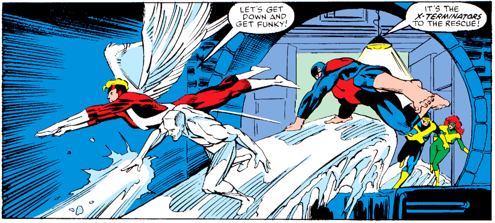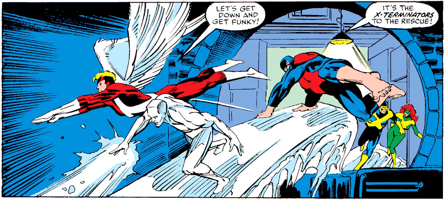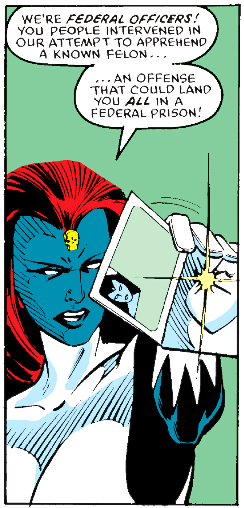 At the start Rusty and Skids are surrounded by Freedom Force... At the end Mystique promises to out Warren Worthingto III (Angel) as secretly funding X-Factor.