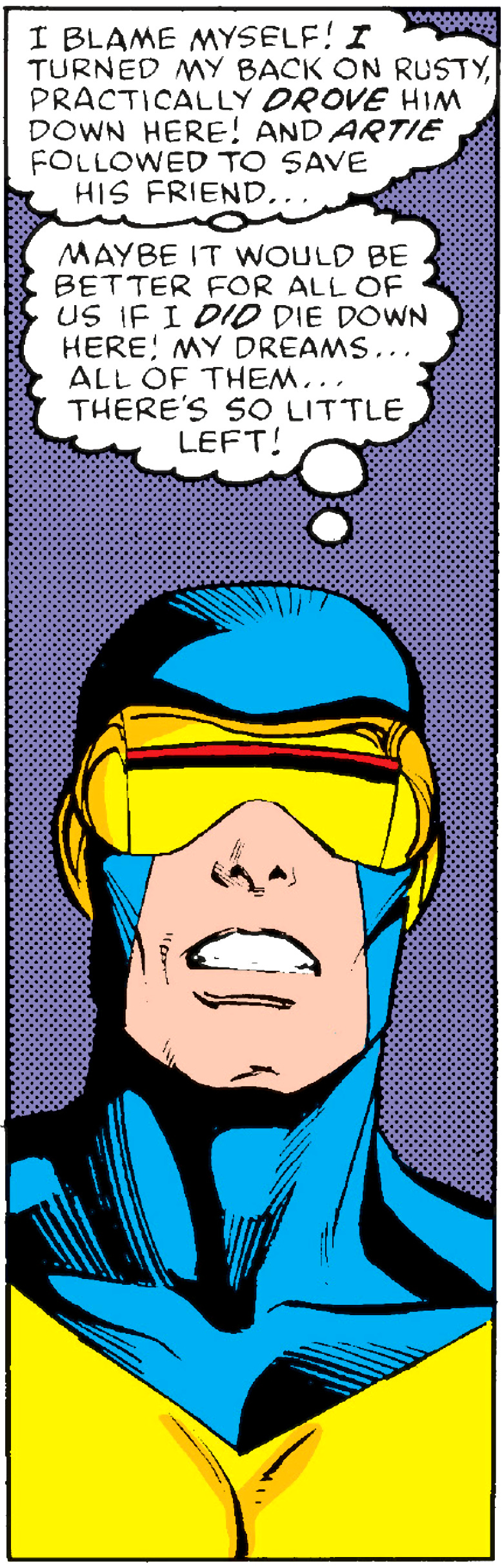 Scott Summers, Cyclops, believing Jean Grey to be dead, meets Madelyn Pryor, a woman who looked like Jean. Scott quickly marries Madelyn they have a baby together. Scott abandons his family when he learns of Jean's return and joins X-Factor. Chris Claremont would describe this in a 1996 interview as a change that "destroys Scott's character as a hero and as a decent human being". During Mutant Massacre, Scott is presented as a conflicted character torn between his love for Jean and his sense of duty towards Madelyn.